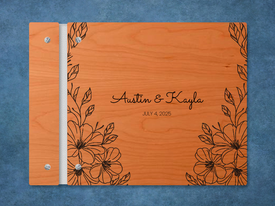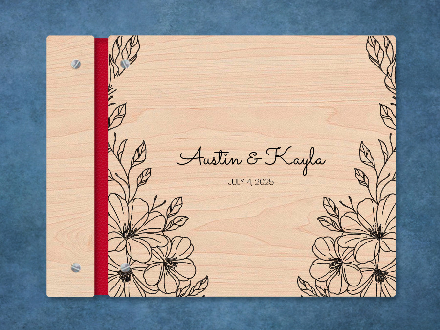 Choose Cherry or Maple (1/8 wood veneer with MDF core) and your hinge color (vegan leather), then add your details in the customization area. A proof will be sent to you for approval prior to beginning your order.