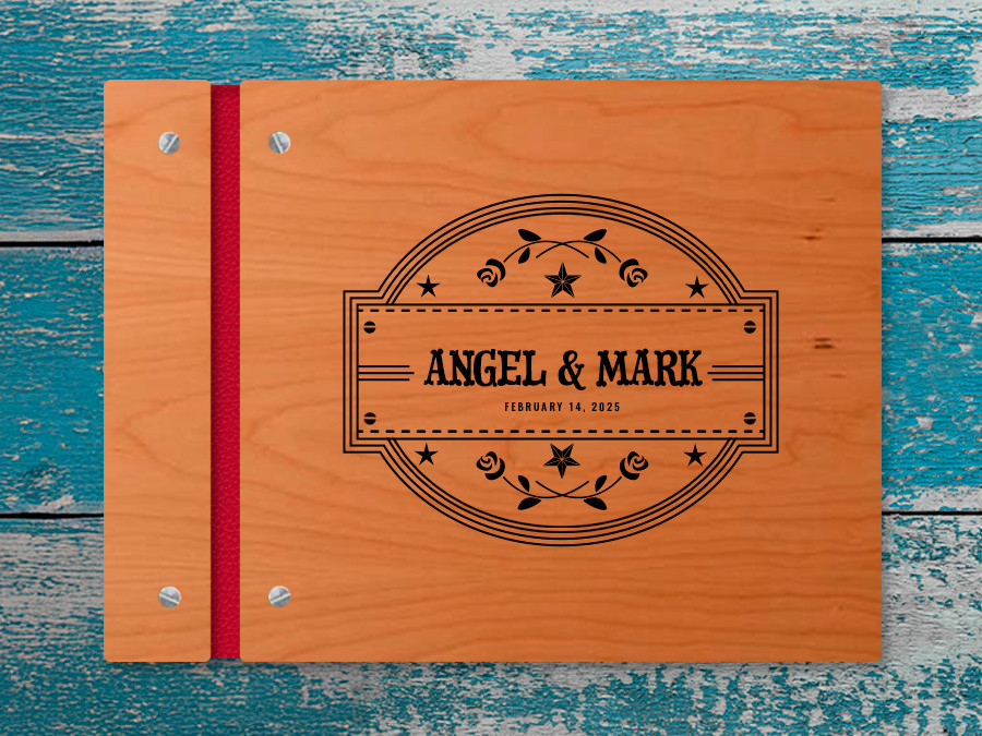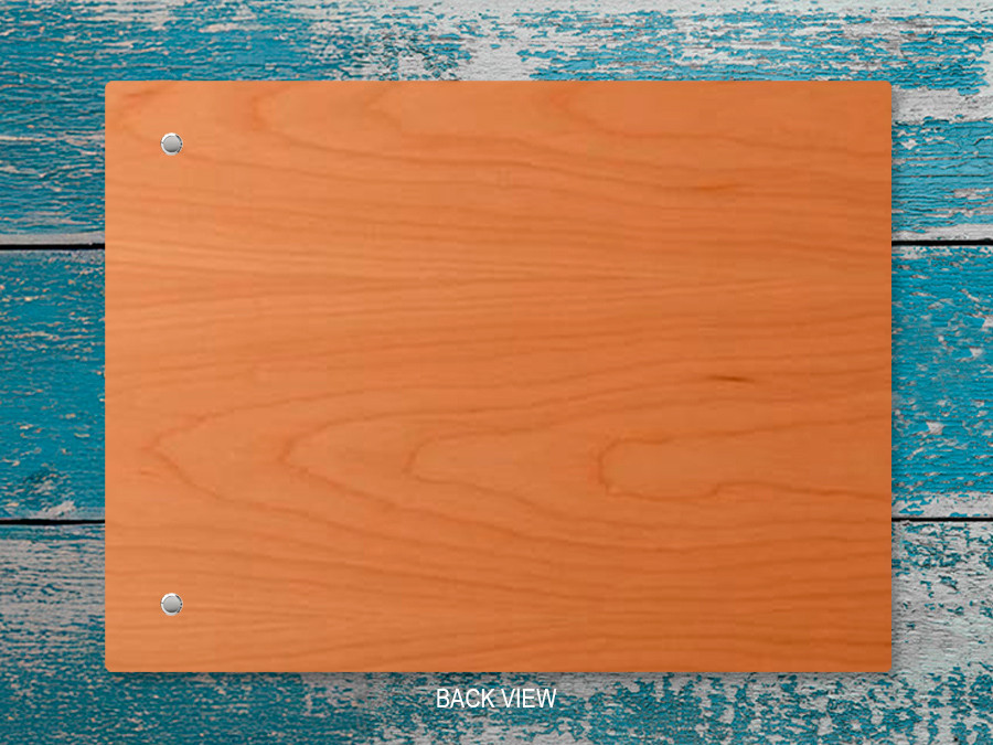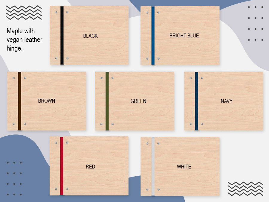 Choose Cherry or Maple (1/8 wood veneer with MDF core) and your hinge color (vegan leather), then add your details in the customization area. A proof will be sent to you for approval prior to beginning your order.